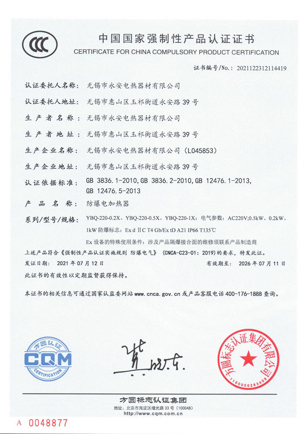 CCC證書-箱體防爆電加熱器